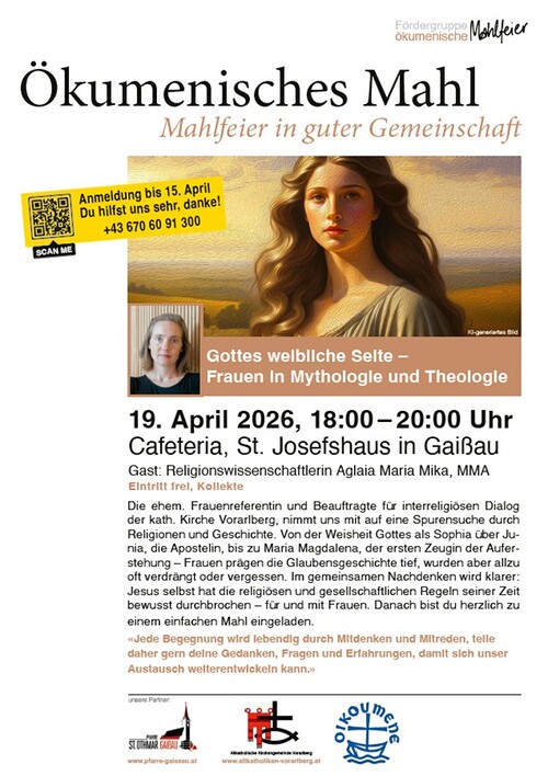 19.04.2026, 18:00 Uhr, 6974, St. Josefshaus Ökumenisches Mahl - Mahlfeier in guter Gemeinschaft Mehr lesen... Mehr lesen