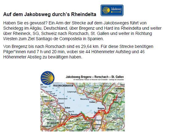 Haben Sie es gewusst? Ein Arm der Strecke auf dem Jakobsweges führt von Scheidegg im Allgäu, Deutschland, über Bregenz und Hard ins Rheindelta und weiter über Rheineck, SG, Schweiz nach Rorschach, St. Gallen und weiter in Richtung Westen zum Ziel Santiago de Compostela in Spanien.